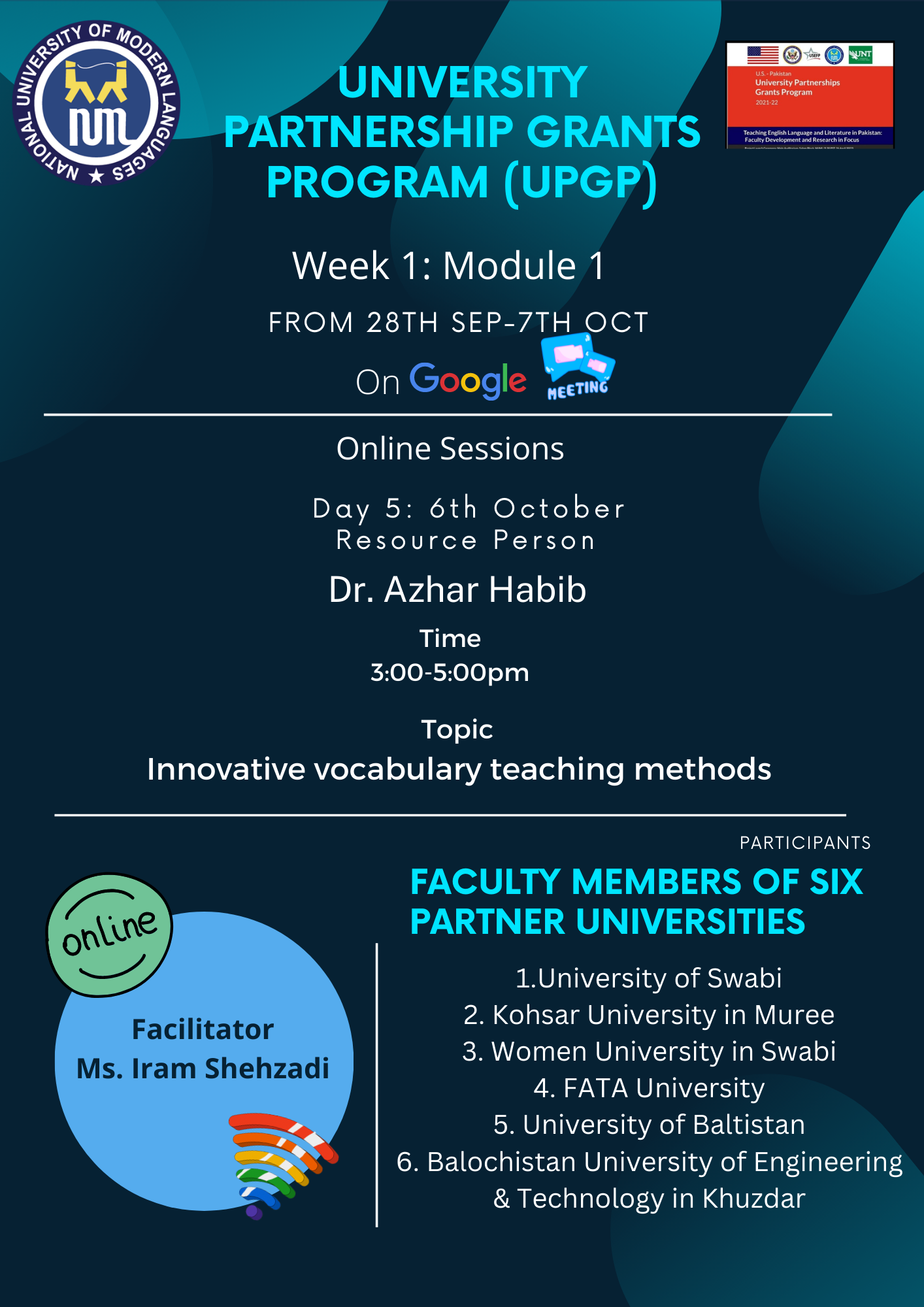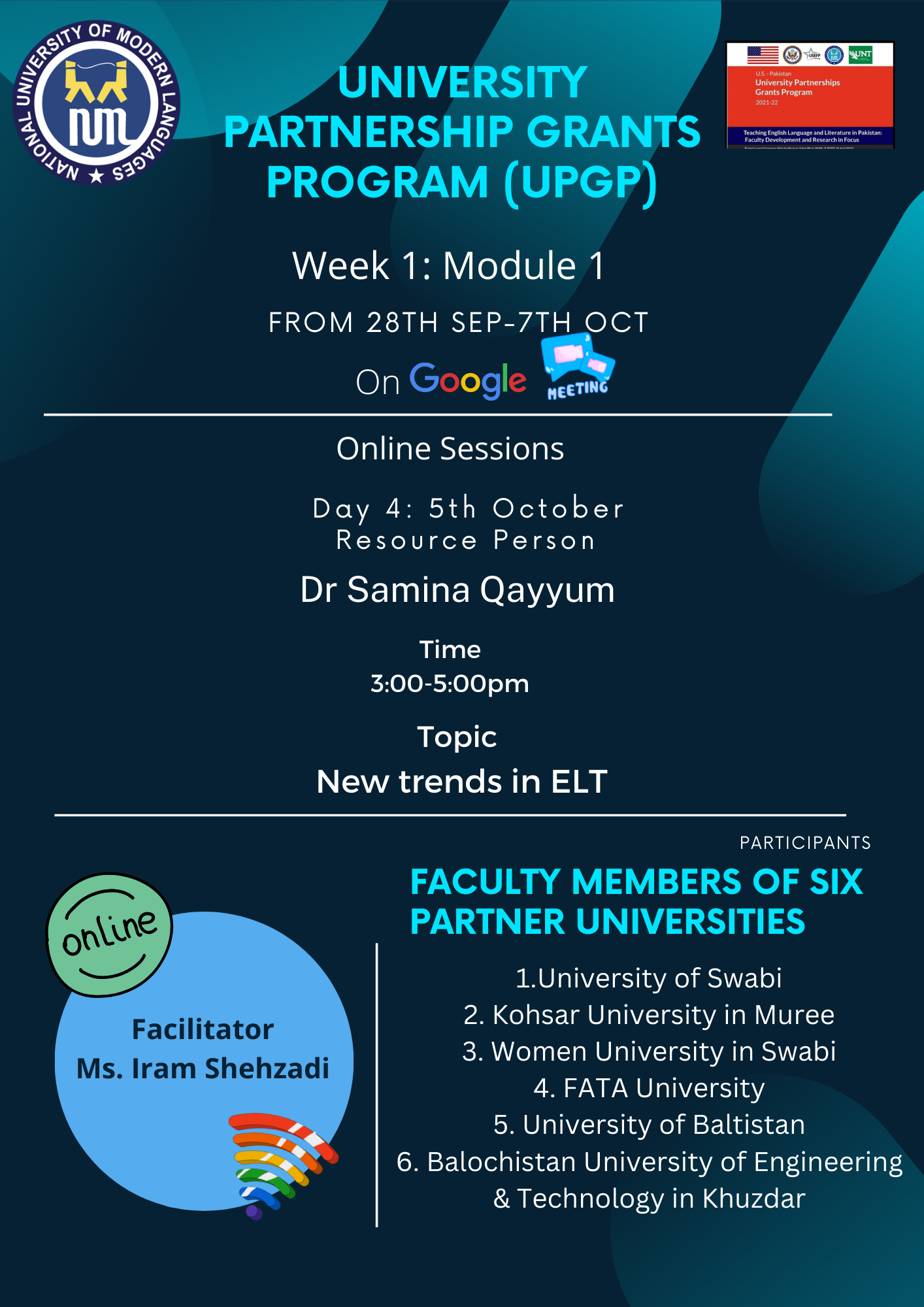 Phase 1 of first Grant was held online on zoom. The trainers were teachers from NUML who went University of North Texas for training. The online session started on 28th September and ended on 7th October.