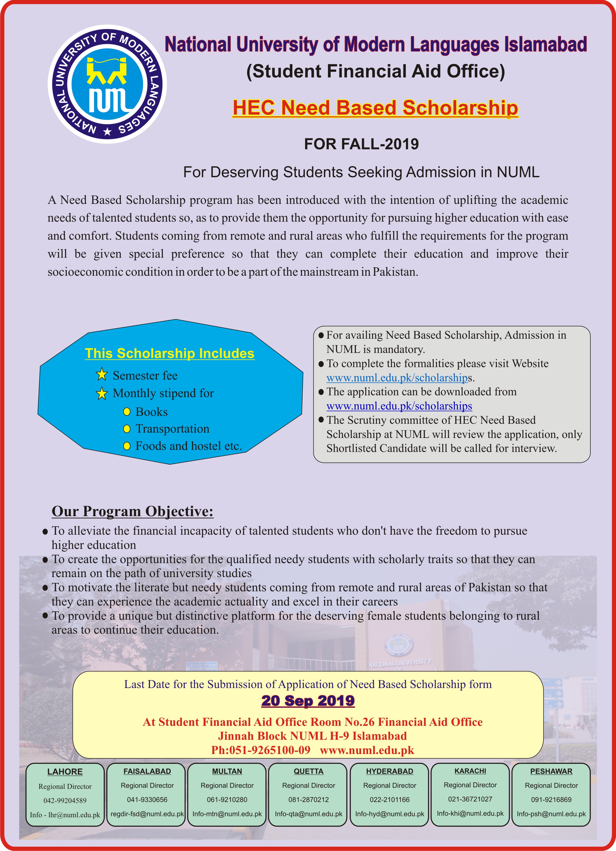 - Admission at NUML is mandatory for applicant to apply for HEC Need Based Scholarship program