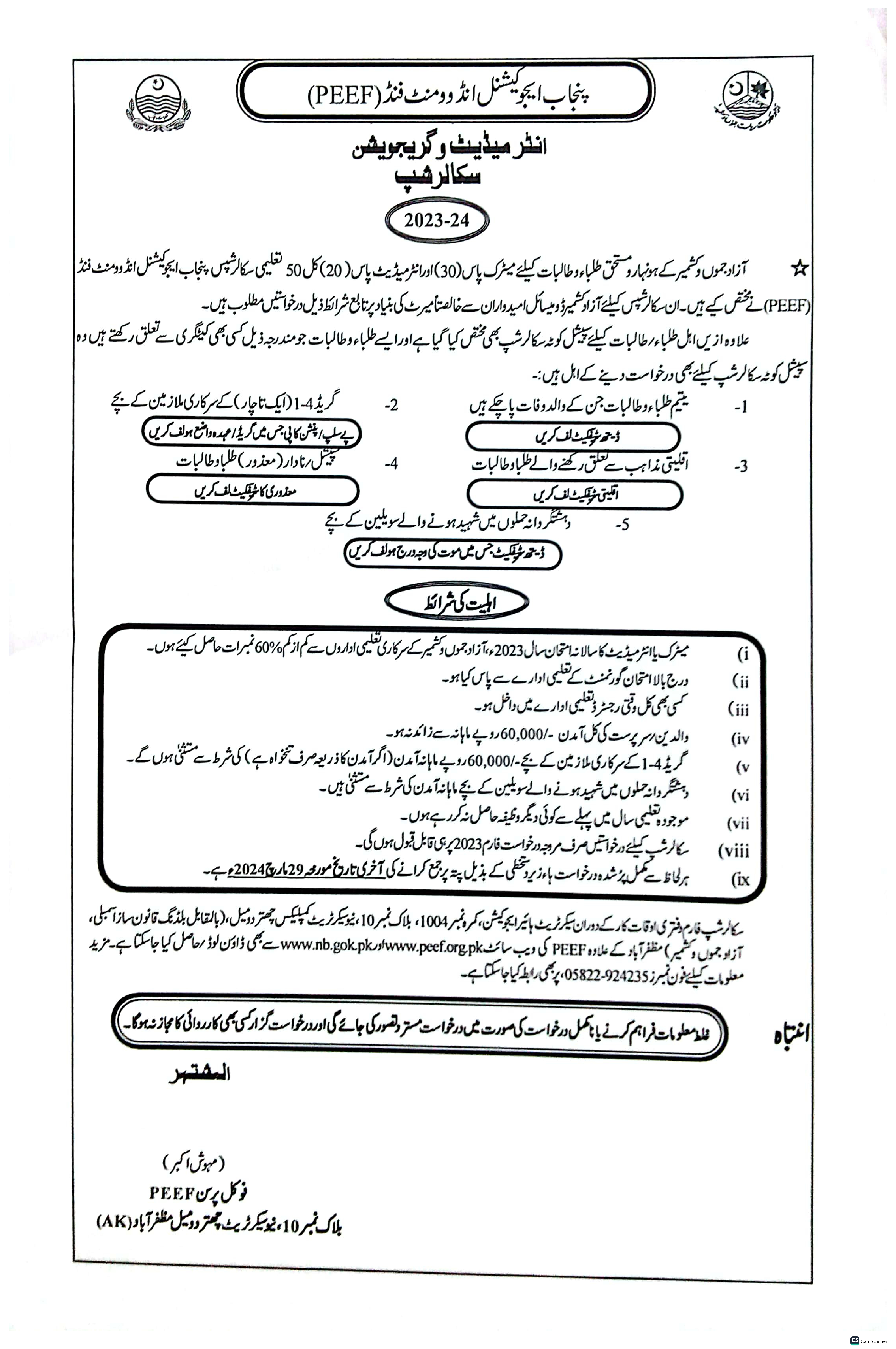 - Passed Matriculation or Intermediate Examination, in annual, conducted by Board of Intermediate and Secondary Education (BISE) Mirpur, AJK